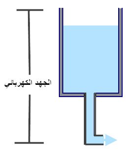 إذا كان لدينا خزان مرتفع عن الارض ملئ بالمياه وتم فتح فيه فتحه في نهايته، متصلة بامبوب كما موضح في الصورة التالية. فإن الضغط في نهاية الانبوب هو يمثل كـ الجهد الكهربائي وكمية المياه بالخزان تمثل كـ الشحنة الكهربائية. فكلما ازدات المياه في الخزان وهي ( الشحنة الكهربائية ) كلما زاد الضغط في نهاية الانبوب وهو ( الجهد الكهربائي ).والخزان يمثل كـ بطارية لمصدر الجهد.