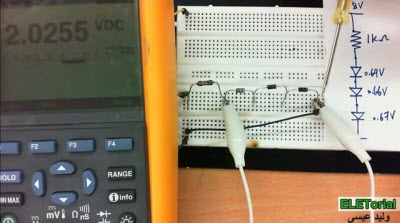 - والجهد حول المقاومة هو جهد المصدر ناقص 0.7 فولت ضريبة الدايود (الجهد الفاقد Drop Voltage) الذي يحتاج اليها ليمرر التيار .