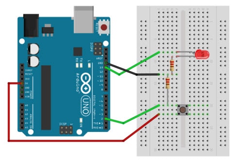 الهدف.. من توصيل الـ switch او المفتاح بهذا الشكل هو أنه عندما يكون في حالته الأساسية (أي: غير مضغوط) يكون الجهد على الـ pin رقم 2 للإردوينو هو جهد GND أي يساوي 0V ويطلق على هذه الحالة LOW. وعندما يكون في حالته الثانية (أي: مضغوط) يصبح الجهد على pin رقم 2 للإردوينو هو جهد 5V ويطلق على هذه الحالة HIGH. وهذه هي الإشارات الرقمية التي سوف نقوم بإستخدامها مع الأردوينو، والتي بناءاً عليها سوف يقوم بتنفيذ أوامر معينة،.. مثل إضاءة الليد أو إطفائه.